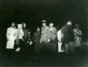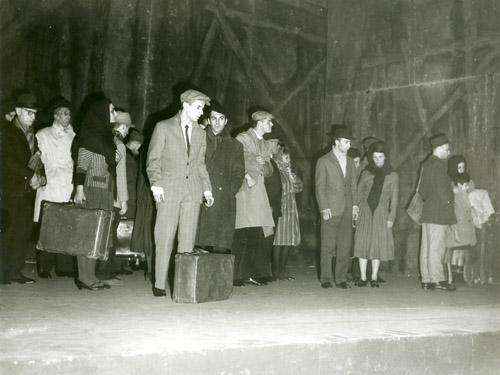 Dans le haut-parleur, le fracas des portières du train ouvertes avec violenceCf.Regarder les extraits de films sur les sélections. Sur un côté de la scène. S’allument des réflecteurs. Les voix des Allemands toujours dans les haut-parleurs, aucune présence sur la scène. Au cours des dialogues, les déportés s’adresseront chacun à un point, provenance hypothétique de la voix, déterminant la position de l’interlocuteur.