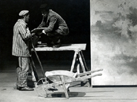 En scène, un mur en construction. Un échafaudage constitué par deux chevalets et une planche. Sur l’échafaudage, Pietro, avec un bac et une truelle. Sur la planche, le bac à mortier. Aldo arrive de la droite, poussant une brouette sur laquelle se trouve une pelle. Il s’arrête au pied de l’échafaudage. Pietro fait signe, avec sa main en cuiller, de prendre le mortier avec la pelle, dans le bac. Aldo regarde sans bien comprendre. QOn se reportera au récit ( standard) de Si c’est un homme, chapitre 13 : Pietro se nomme Lorenzo et on comparera les deux versions. Y avait-il des Français qui étaient réquisitionnés pour aller travailler en Allemagne ? Comment cela s’appelait-il ?