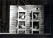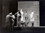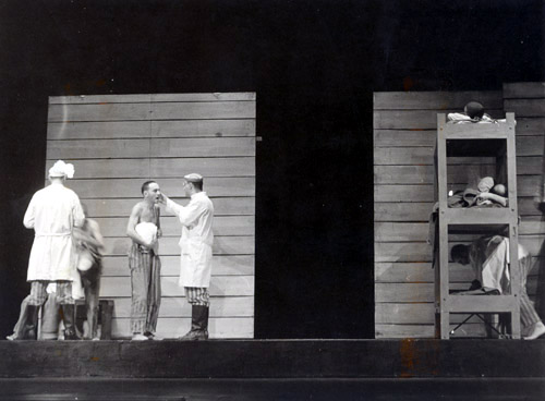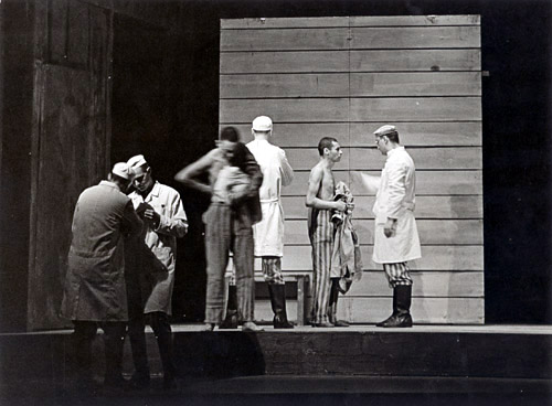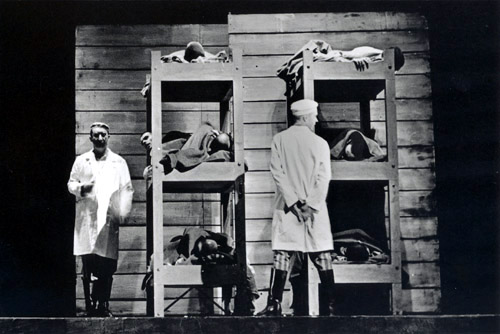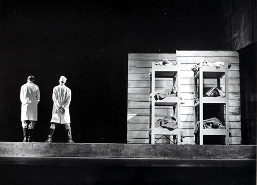 La lumière baisse puis disparaît. Puis elle découvre, au fond de la scène, une baraque dont l’intérieur est visible. On y accède par une porte latérale gardée par un Häftling dans une guérite. Il fait retirer leurs chaussures aux malades, qui ne peuvent entrer que déchaussés. Le Häftling portier, au moment du dépôt de chaussures, remet un ticket. Devant la porte, une longue file indienne de malades ; quelques-uns ont des bandes à demi-déroulées qui leur pendent des jambes. A mesure que leur tour d’entrer approche, les malades s’efforcent de détacher les liens de fortune et les fils de fer qui tiennent leurs chaussures attachées, en gardant leur équilibre du mieux qu’ils peuvent. Pas trop tôt, pour ne pas rester pieds nus dans la boue, pas trop tard, pour ne pas perdre leur tour. Tous portent leur gamelle, et ils retirent à mesure tous les objets qu’ils portent, ainsi que leur béret, avant d’entrer dans la baraque. A l’intérieur, la queue continue. Les malades se déshabillent progressivement, pour arriver torse nu devant le banc qui se trouve au milieu. Là, ils s’assoient, au coude à coude. Quand ils sont arrivés au banc, un infirmier leur tend un thermomètre. Tous tiennent le petit tas de leurs misérables objets personnels. Au bout du banc, se tient le médecin, qui passe debout et très sommairement la visite des malades. Après la visite, les malades sont envoyés dans trois directions différentes : quelques-uns sortent par le fond, d’autres de côté. Et d’autres encore en coulisse, très en avant vers la fosse, où se trouve deux infirmiers Polonais qui fument et bavardent de façon incompréhensible. Aldo est maintenant près du banc.