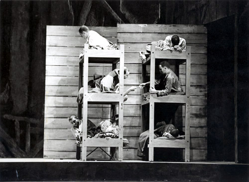 Tandis qu’il accompagne Aldo vers le fond, la scène s’illumine tout entière. Au fond, deux étages de trois couchettes chacun. A droite, la couchette centrale est vide. A gauche, la couchette centrale est occupée par Schmulek et Walter. Au dessus de Schmulek, seul dans sa couchette, Henri. Les autres couchettes sont toutes occupées par deux malades. Le 2ème Polonais indique la couchette vide à Aldo, et lui donne sa chemise, puis lui ôte des mains le petit paquet de ses affaires, malgré les faibles efforts d’Aldo pour le garder. Ceci fait, il sort de scène. Ricanements des malades, qui se penchent, intrigués, pour regarder Aldo. Quelqu’un tousse. Aldo, dans l’espace compris entre deux couchettes, enfile sa chemise.
