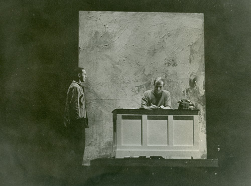 Aldo se penche pour ramasser son béret, tandis que la lumière s’éteint. Puis la lumière découvre au milieu de la scène, au fond, un bureau très haut, sur lequel est posé un téléphone, un dictaphone, un encrier avec un stylo, un bloc de papier et quelques livres. Au bureau, assis sur une chaise à pivot, le docteur Pannwitz en train d’écrire. Ayant fini, il appelle au dictaphone. Dans un coin, une chaise.